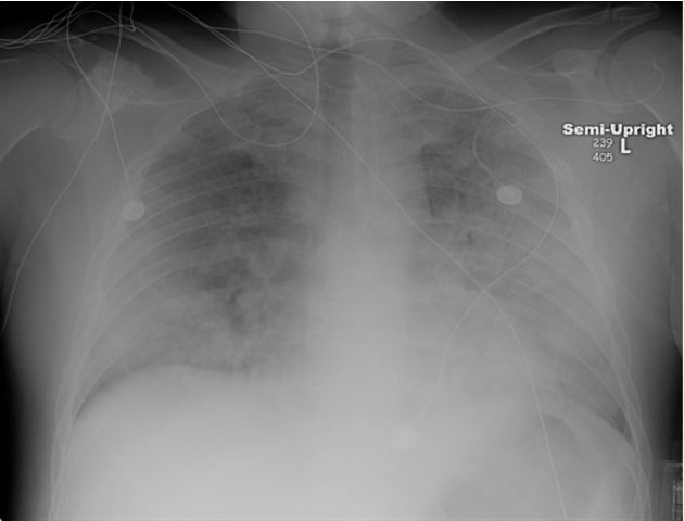 The patient was treated for sepsis and severe community acquired pneumonia with empiric piperacillin- tazobactam and vancomycin. Over the next two days, the patient’s respiratory status worsened and he required intubation and mechanical ventilation. Chest radiographs showed bilateral diffuse pulmonary infiltrates consistent with acute respiratory distress syndrome (ARDS) (Figure 2). Bronchoscopy with bronchoalveolar lavage revealed no evidence of alveolar hemorrhage, cell count with 65% neutrophils, 26% lymphocytes and 9% macrophages and cytology and all cultures were unrevealing. HIV serology was negative. Legionella urinary antigen was negative. The subsequent physical examination showed a petechial rash on the lower extremities.
