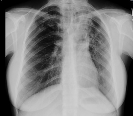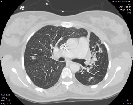 A 38 year-old woman, with cystic fibrosis/bronchiectasis (genotype F508/F508) presented to the emergency department for sudden onset massive hemoptysis. She accounted an approximate volume of 6-8 ounces of blood. She denied any associated chest pain, worsened productive sputum or dyspnea prior to the massive hemoptysis episode. 2 hours later, she complained of a non-radiated, stabbing right-sided chest pain with an intensity of 3 out of 10 level.