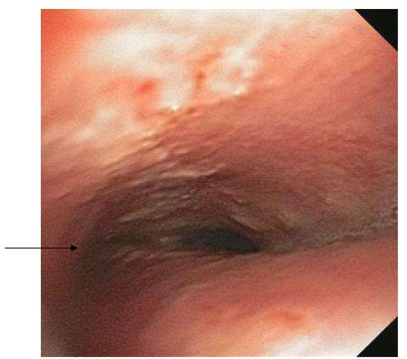 Figure 3. Photo taken during bronchoscopy demonstrating abnormal appearance of tracheal wall and cartilaginous rings at the level of the carina. Note the relative flattening of the left mainstem bronchus compared to the right.
