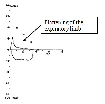 All of the above are potential long term complications of tracheomalacia except for development of restriction on PFTs. In fact, there is limitation on the expiratory component, which leads to an obstructive pattern on the PFTs. PFTs can also show reduced mid- expiratory/mid-inspiratory ratio, as below.3 The flow-volume loop may show flattening due to the collapse of the trachea on expiration. Tracheal and bronchial collapse during coughing leads to decreased ability to clear secretions and can thereby lead to recurrent respiratory tract infections and, in severe cases, respiratory failure.