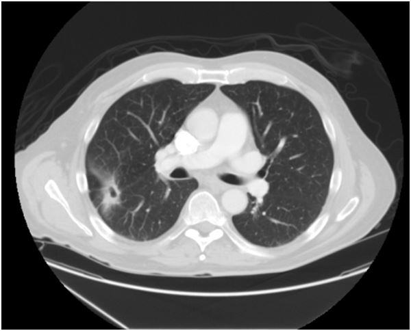 A chest CT scan was repeated this admission which revealed a 2 cm cavitary mass in the right mid lung with a thick wall and spiculations extending to the pleural surface.