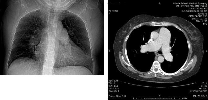 Figure 2. CT pulmonary angiogram scout film (Left) and axial cut (Right) showing severe dilation of the pulmonary artery trunk and main right and left branches. Note the diameter of the pulmonary artery exceeds that of the aorta. No proximal filling defects are seen.