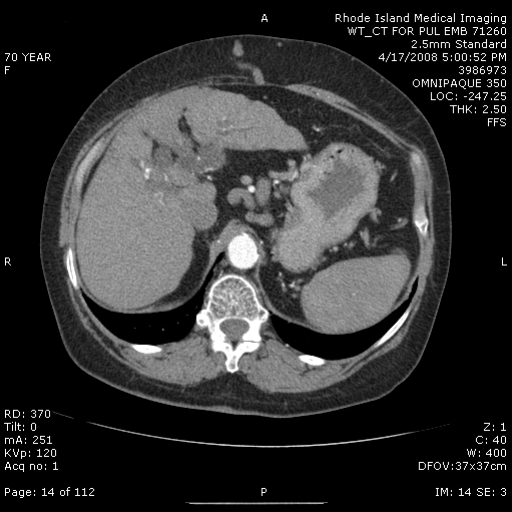 A 70-year-old woman with a history of alcoholic liver disease, peptic ulcer disease, chronic obstructive pulmonary disease (COPD) and hypothyroidism was referred for progressive dyspnea and evaluation of enlarged pulmonary arteries on chest radiograph. She had smoked approximately one pack of cigarettes daily for 40 years and developed exertional dyspnea 2-3 years earlier. At that time, she was diagnosed with COPD and inhaled bronchodilators were prescribed. She continued to smoke and her dyspnea worsened. Inhaled bronchodilators had little effect. Six months earlier she had been admitted to the hospital with Clostridium difficile colitis, gastrointestinal bleeding and COPD exacerbation. During that admission, she quit smoking and was started on supplemental oxygen therapy. A chest radiograph during the hospital stay showed cardiomegaly and large bilateral pulmonary arteries (Figure 1). Upon discharge she was referred to a pulmonologist for further evaluation. A computed tomographic pulmonary angiogram (CTPA) confirmed the presence of enlarged pulmonary arteries, but no proximal filling defects were identified (Figure 2). The lung parenchyma showed mild emphysematous changes, but no large bulla. Abdominal images revealed hepatomegaly with portal and esophageal varices (Figure 3). A transthoracic echocardiogram (TTE) found normal cardiac chamber sizes with no evidence of valvular heart disease and normal pulmonary artery pressure.