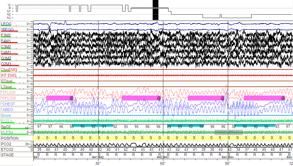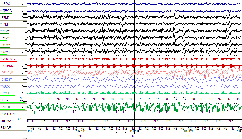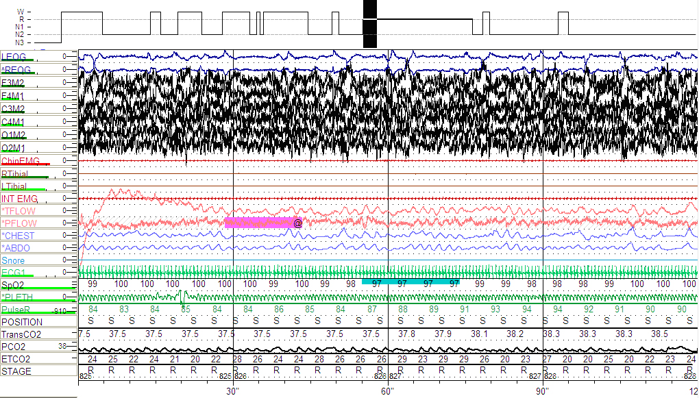 LEOG AND REOG, left and respectively right outer cantus electro-oculography electrodes; F3-M2, C3-M2 and O1-M2, left frontal, central and respectively, occipital electroencephalography electrodes; F4-M1, C4-M1 and O2-M1, right frontal, central and respectively, occipital electroencephalography electrodes; Chin EMG, submental electromyography signal; INT EMG, intercostals electromyography signal; ECG II, one standard electrocardiogram lead; RTibial and LTibial, right and respectively left lower limbs electromyography electrodes; SNORE, the snoring sound via microphone; TFLOW, the airflow via nasal/oral thermocouples; PFLOW, the airflow via nasal air pressure transducer; CHEST and ABDO, chest and respectively abdominal walls motion via inductive plethysmography; SpO2, the pulse oximetry by finger probe; PLETH, phlethysmographic waveform; POSITION, S=Supine; PCO2 and ETCO2, end tidal CO2 monitoring with accompanying waveform.