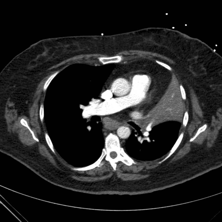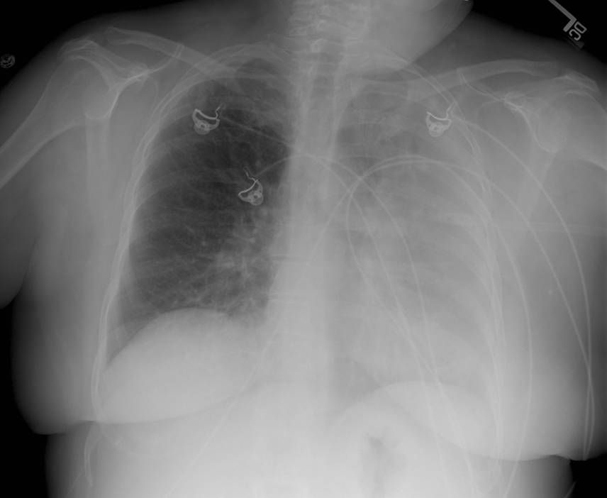 Her vital signs included a temperature of 101° F, respiratory rate of 28, blood pressure of 152/91 and heart rate of 99/min. Oximetry was 87% on room air. Physical exam revealed an obese female in mild respiratory distress. No accessory muscle use was noted. Right sided lung fields were clear. Left sided lung fields were clear posteriorly but diminished anteriorly. Cardiac exam was normal. No palpable lymphadenopathy was appreciated in the supraclavicular or axillary regions. The rest of the exam was unremarkable.