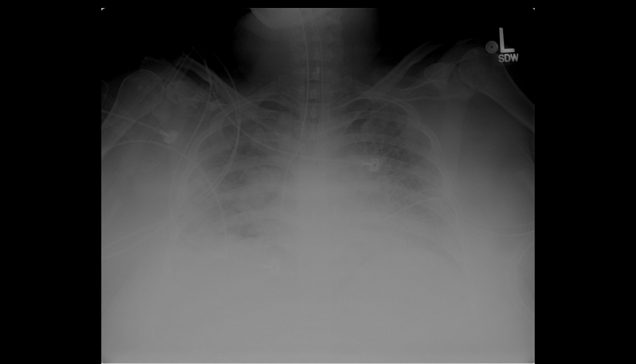 On examination, the patient’s pulse was 94 beats per minute and regular. She had a temperature of 101.3 degrees Fahrenheit and a blood pressure of 98/31 mm Hg. Her oxygen saturation was 84% on 100% O2 by nonrebreather mask and had a respiratory rate of 32 breaths per minute. Cardiovascular exam revealed no murmurs. Respiratory exam showed bilateral crackles. Abdominal exam showed gravid uterus, otherwise unrevealing.