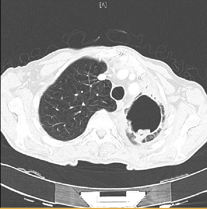 The consolidation surrounding the cavity on CT and the new tree-in-bud opacification are suggestive of pulmonary infection, be it bacterial or fungal. This upper-lobe consolidation is also apparent on the plain chest radiograph, as is an air-fluid level. The above findings would be consistent with bacterial pneumonia, and the presence of an aspergilloma-containing cavity increases the susceptibility to bacterial infection. The clinical picture would also be consistent with a bacterial superinfection – cough productive of green sputum, upper-lobe crackles on auscultation and raised white cell count with associated neutrophilia. Diagnosis would be based on a positive bacterial culture on sputum or bronchoalveolar lavage specimens, and clinical and radiological improvement with appropriate antibiotic treatment.