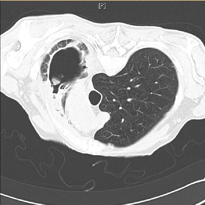 Figure 5. CT Angiography. No pulmonary embolus was identified, a consolidation surrounding the cavity was seen and new “tree-in-bud” opacification was present in the right-lower lobe.