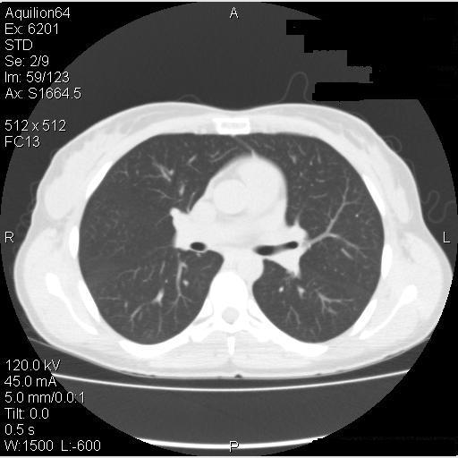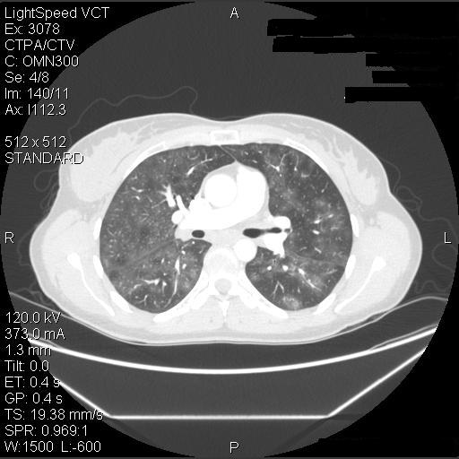 The patient was advised to avoid all possible agents in her environment which could have triggered hypersensitivity pneumonitis – the barn itself, horse-feed and horse-feed supplements, pigeons, and the hot tub. Since she did not have help on the farm she was not able to avoid the barn or feeding the horses but she did stop using the feed supplement and avoided the barn loft. Due to the severity of her symptoms, she was started on prednisone, initially 25 mg per day. She had a marked improvement in her symptoms, with a return to almost normal exercise tolerance and resolution of her pulmonary function abnormalities within a few days. She then returned to her usual activities without recurrence of symptoms although she continued to avoid the horse-feed supplement. Her pulmonary function testing progressively improved (Table 3), and CT scans 2 months and 6 months later also progressively cleared (Figure 5).