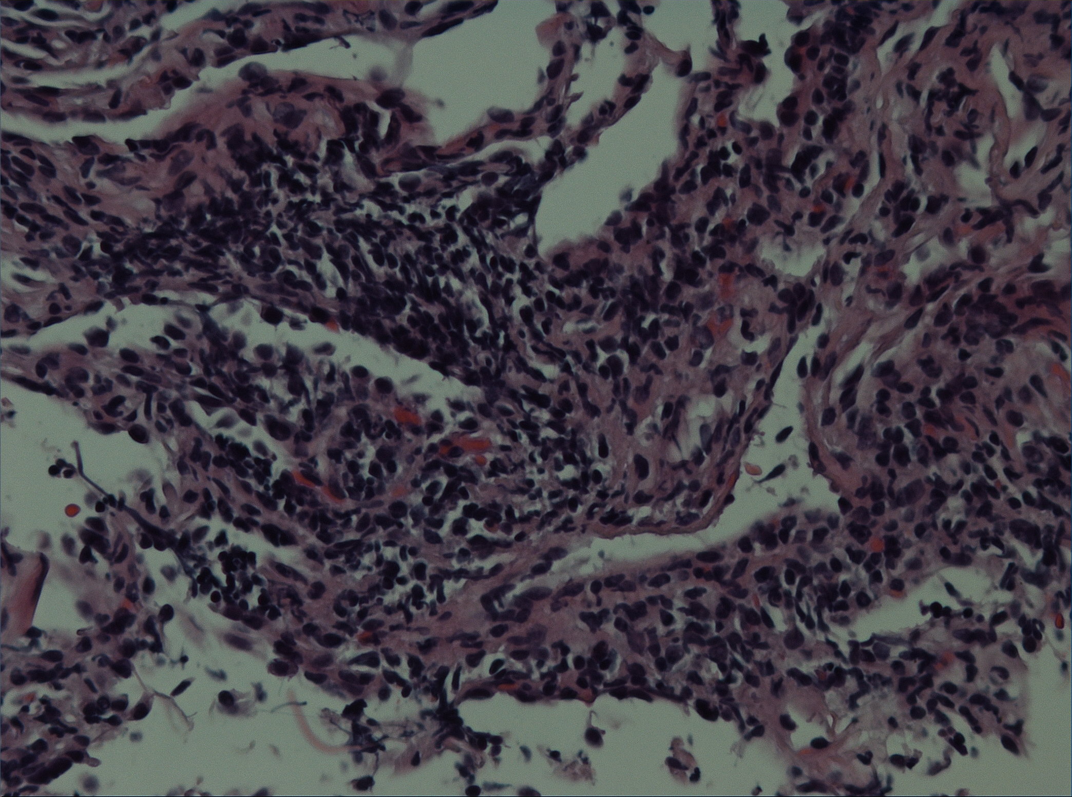 E. Interstitial lung disease from cobalt exposure. The only change in the patient’s environment that was temporally associated with development of her acute symptoms was the introduction of a new horse-feed supplement, which included iron, cobalt and copper. Cobalt-induced lung disease has been well-described in workers engaged in the manufacture, utilization, or maintenance of tools composed of hard metal [a material composed mainly of tungsten carbide and cobalt] or diamond-cobalt8,9. Better known as “hard metal disease” or “cobalt lung”, this entity is associated with giant cell interstitial lung disease which is considered to be a hypersensitivity response to cobalt. It can have a subacute presentation of fever, weight-loss, non-productive cough and dyspnea10, with a possible evolution to pulmonary fibrosis. Although most often reported with exposure to tungsten carbide, it has also been reported with exposure to cobalt without concurrent tungsten exposure. Experimental studies demonstrate that cobalt metal and metallic carbides can also induce lung toxicity possibly due to the production of activated oxygen species11. Although manufacturing of animal feed has been listed as a cause of cobalt-related dermatitis12, we were unable to find any reports of cobalt-related lung disease in manufacturers or farmers using these supplements. We hypothesize that this patient may have had previous cobalt exposure in horse-feed supplements, perhaps causing sensitization, but the fine dust in the new supplement may have resulted in greater cobalt inhalation and subsequent alveolitis. The more classical histologic finding of interstitial lung disease related to cobalt is that of giant cell interstitial pneumonitis. No giant cells were apparent on the biopsy from this patient and therefore the histology was not diagnostic but remains consistent with a hypersensitivity response, which in this case appeared likely to be due to exposure to cobalt.