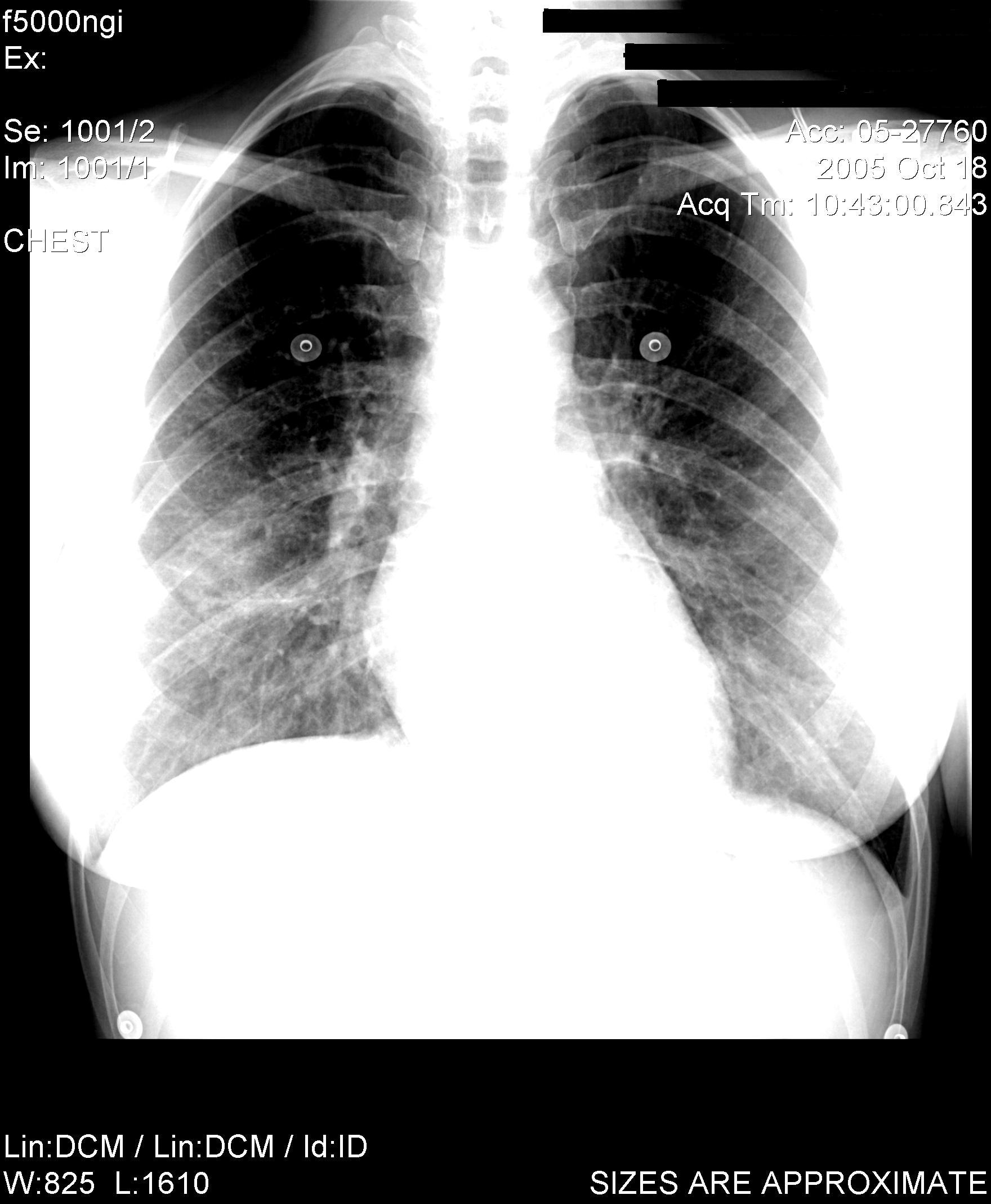 6. Three of these patients developed a nonproductive cough, dyspnea with exertion and minimal or no abnormal findings on auscultation. Chest radiographs at the time of the initial presentation showed basilar infiltrates similar to this case. Pulmonary function testing during their initial presentations showed decreased lung volumes without a primary obstructive disease. All of the patients improved with removal of exposure to further cobalt (+/- addition of systemic corticosteroids), and each recurred when they were re-introduced to environments with cobalt