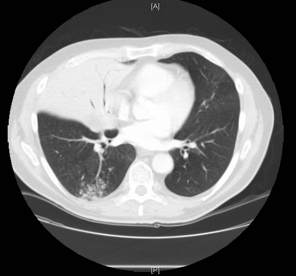 Vital Signs: T: 36.8, P:82, R: 18, BP: 135/90 Well developed, well nourished male who was well oriented, HEENT: unremarkable, Chest: normally expanded with dullness to percussion in the right lower lung field with faint late inspiratory crackles and that area,