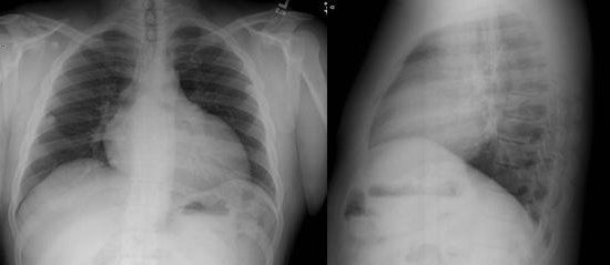 Figure 1. PA and lateral chest radiographs from the patient. The images show mild elevation of right hemi-diaphragm, normal lung fields and cardiomegaly.