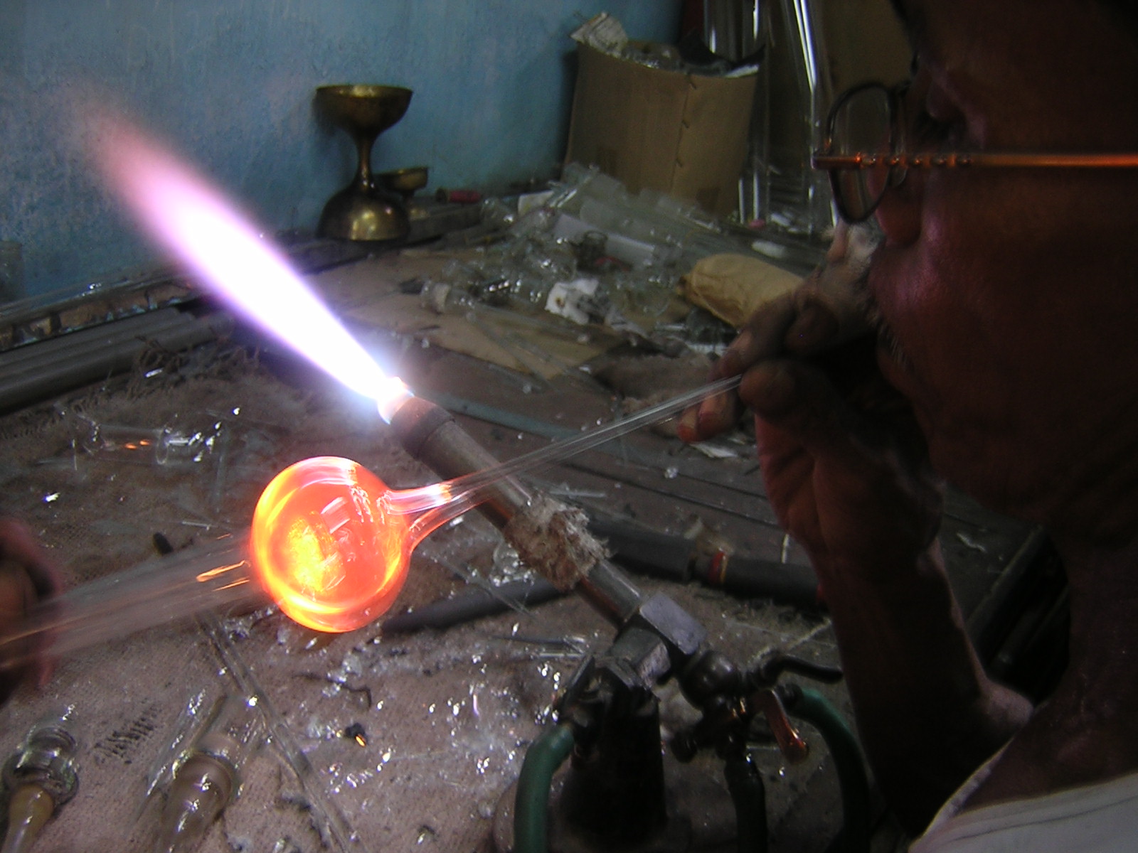 He complained of cough with minimal mucopurulent expectoration and fever, which had not responded to a ten-day course of gatifloxacin, 400 mg daily.He was a non-smoker and had no significant medical or surgical illness in the past. He had worked as a glass blower (mouth blower) for 40 years and had retired from work 5 years before this assessment. The glass blowing was done in a workshop with a glass pipe made of borosilicate (figure 2). This pipe was used to blow the molten glass to give the desired shape to make scientific glass equipment like test tubes and flasks. The glass tube to be blown was loaded on the borosilicate glass pipe. The glass is then melted by holding it over an arc light generated by flaming a mixture of air with liquefied petroleum gas (figure 3). The molten glass is then blown by mouth to give the desired shape (figures 4 and 5).