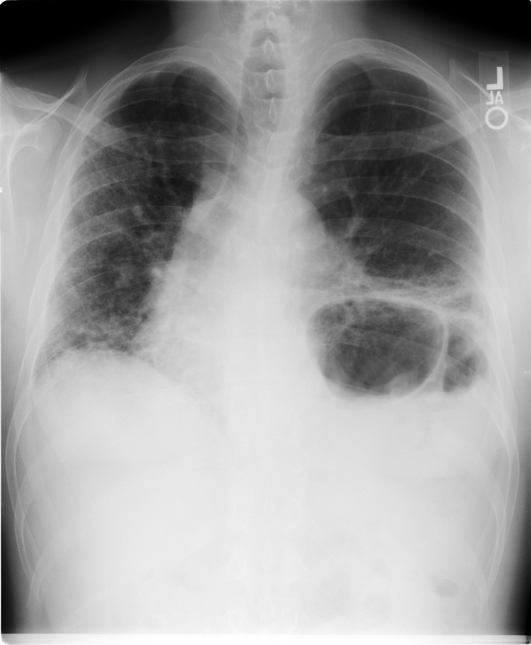 Chest radiograph shows bilateral reticular markings and an elevated left hemidiaphragm