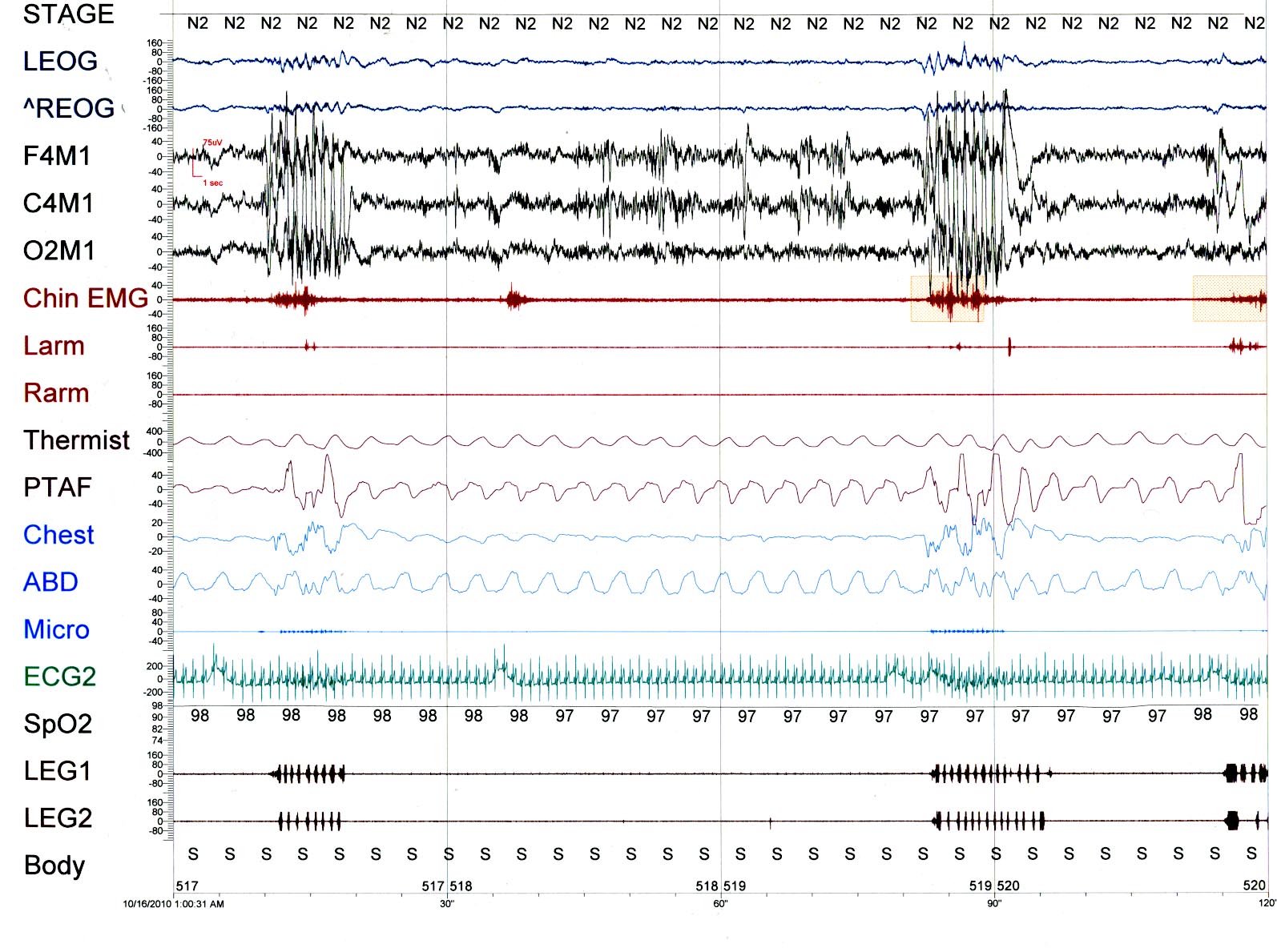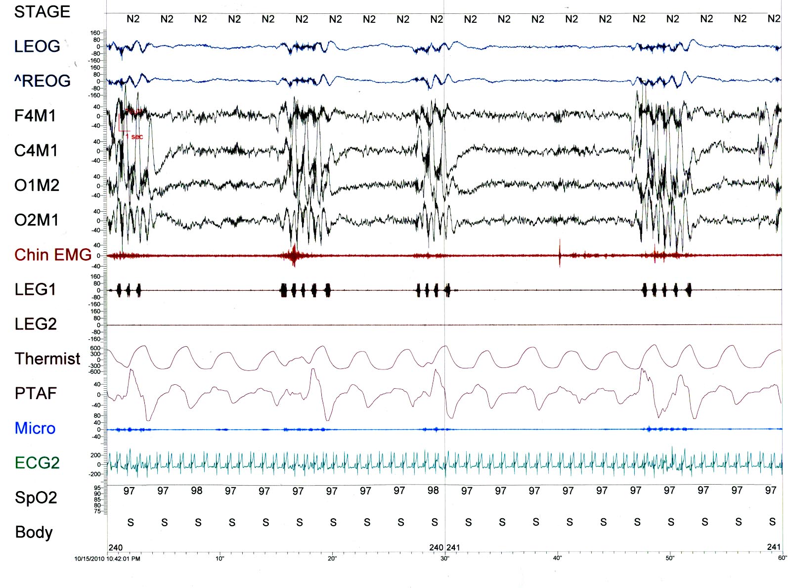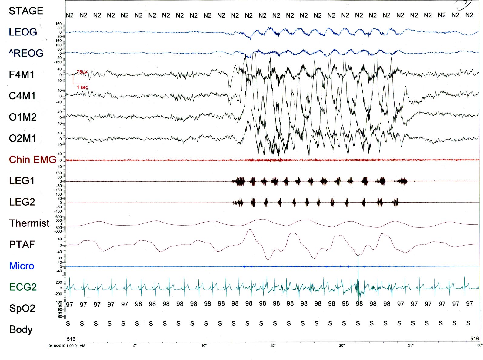 In the PSG tracing we see episodes of 1 Hz. activity across the EEG and leg leads corresponding to movement in the EMG, EKG artifact and chest and abdomen with enhanced PTAF. The frequency corresponds to video monitoring showing head movement consistent with Rhythmic Movement Disorder.