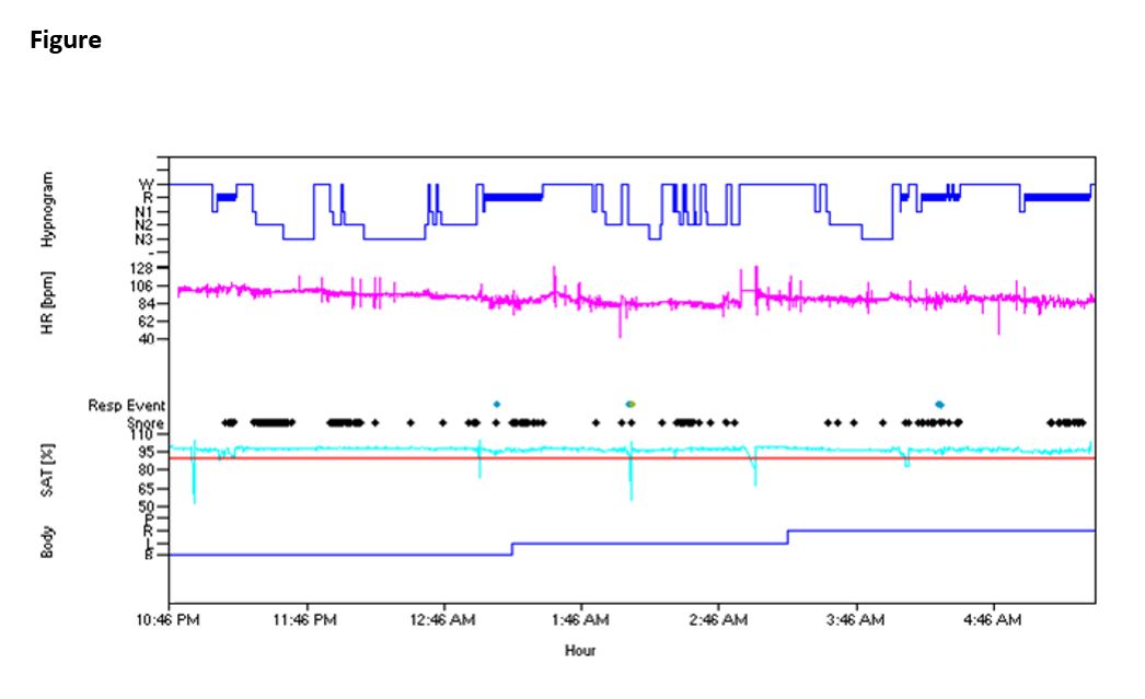 The patient’s Epworth Sleepiness Scale (ESS) score was 11/24. Her body mass index (BMI) was 36, and her neck circumference was 17 inches. She had a Mallampati class III oropharynx. Recent magnetic resonance imaging of the brain showed age-related changes with no identified focal abnormalities.