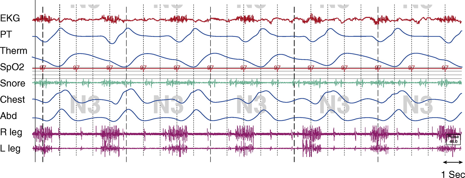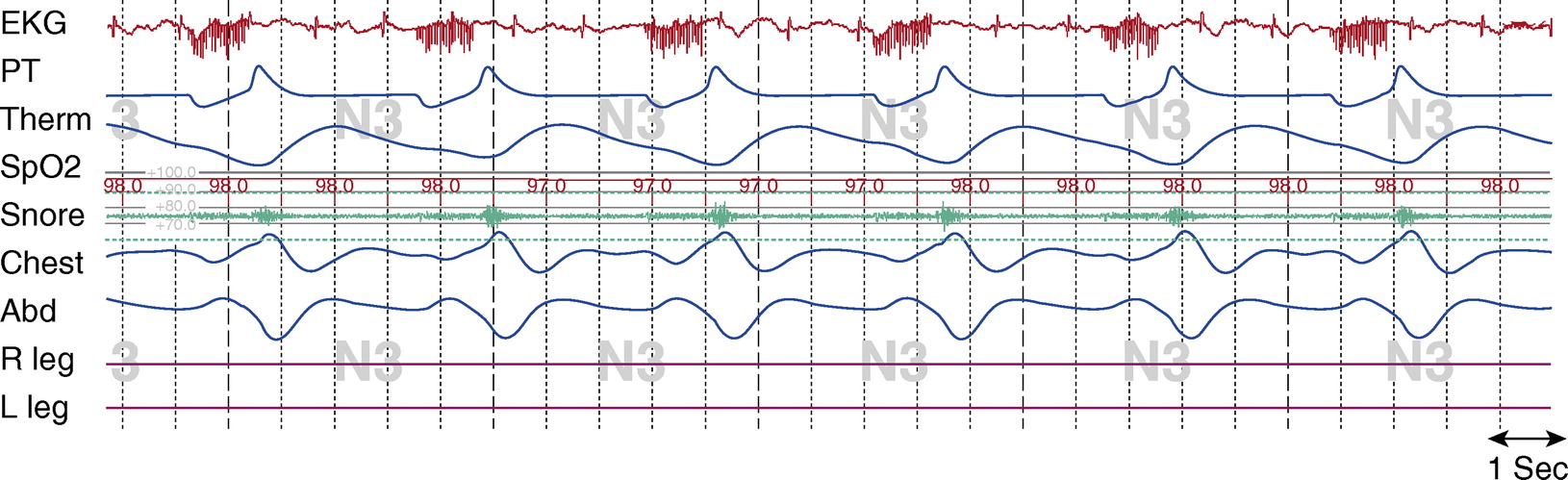 Stage N3, tracheostomy open.Tcco2 was 40 to 45 mm Hg throughout study. Chest and Abd = piezo-electric respiratory belts for chest and abdomen, respectively; EKG = electrocardiogram; PT = pressure transducer; R leg and L leg = electromyogram of right leg and left leg, respectively; Spo2 = pulse oximetry–determined oxygen saturation; Tcco2 = transcutaneous CO2; Therm = thermistor.