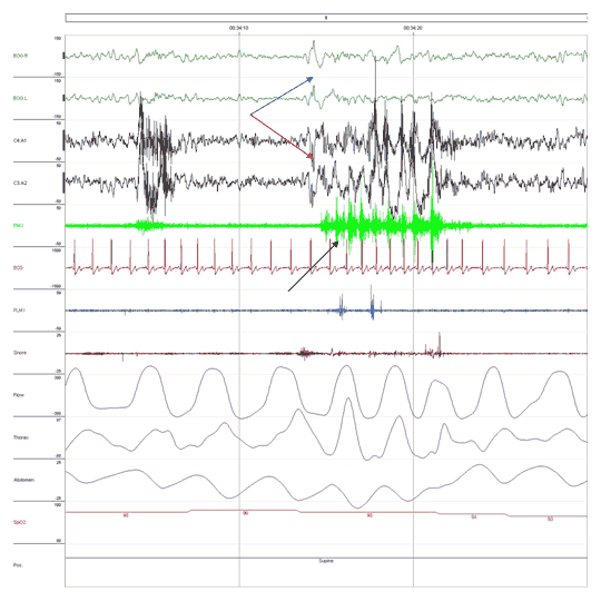 - This fragment shows 30 seconds of sleep during which sleep-related bruxism has been scored (black arrow).