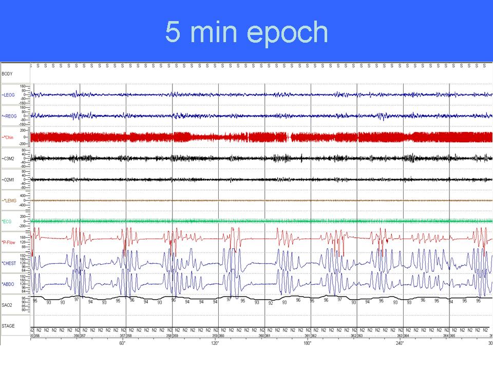 Discussion: This is a 5-minute polysomnogram fragment from a patient in stage N2 sleep on chronic opioid medication revealing an ataxic breathing pattern associated with intermittent oxygen desaturations. Note that the breathing pattern has variation in depth and rate with frequent pauses largely in the form of central and obstructive disordered breathing events. This breathing pattern with irregular variation in depth and frequency has been previously described by Biot in 1876 and is referred to as “Biot’s respiration” (1). Please note that the disordered breathing events observed with Biot’s respiration are characteristically short. This is in contrast to Hunter-Cheyne –Stokes breathing (Hunter was the first physician who described this pattern of breathing), which is frequently observed in systolic heart failure and is characterized by prolonged crescendo/decrescendo changes in tidal volume (2).