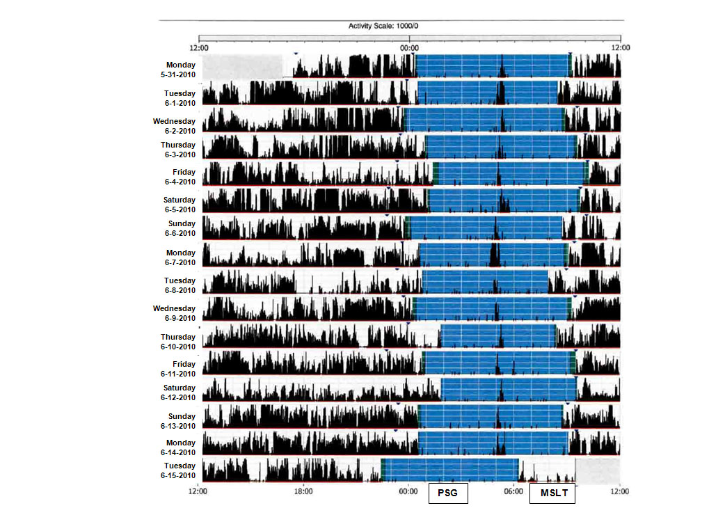 A 48 year-old female Turkish immigrant was referred to our clinic for evaluation of longstanding excessive daytime sleepiness. At clinical presentation the patient reports rare snoring without apnea, short muscle twitches in both arms during sleep onset and an occasional nocturnal short-lasting holocranial “burning sensation” of mild. Co-morbidities included essential hypertension, chronic fibromyalgia and depression, treated with sertraline 50mg/d. Except for successful surgical decompression for chronic trigeminal neuralgia a few years ago, her personal medical history was uneventful. At initial assessment, she presented with excessive daytime sleepiness (Epworth Sleepiness Scale: 17/24) and fatigue (Fatigue Severity Scale: 6/7). Clinical examination was unremarkable. 8h polysomnography was performed and showed normal sleep architecture without relevant sleep related pathologies. The MSLT showed an average sleep latency of 3.6 min (first 4 naps) without sleep onset REM. Actigraphy was performed for 2 weeks and is shown below.
