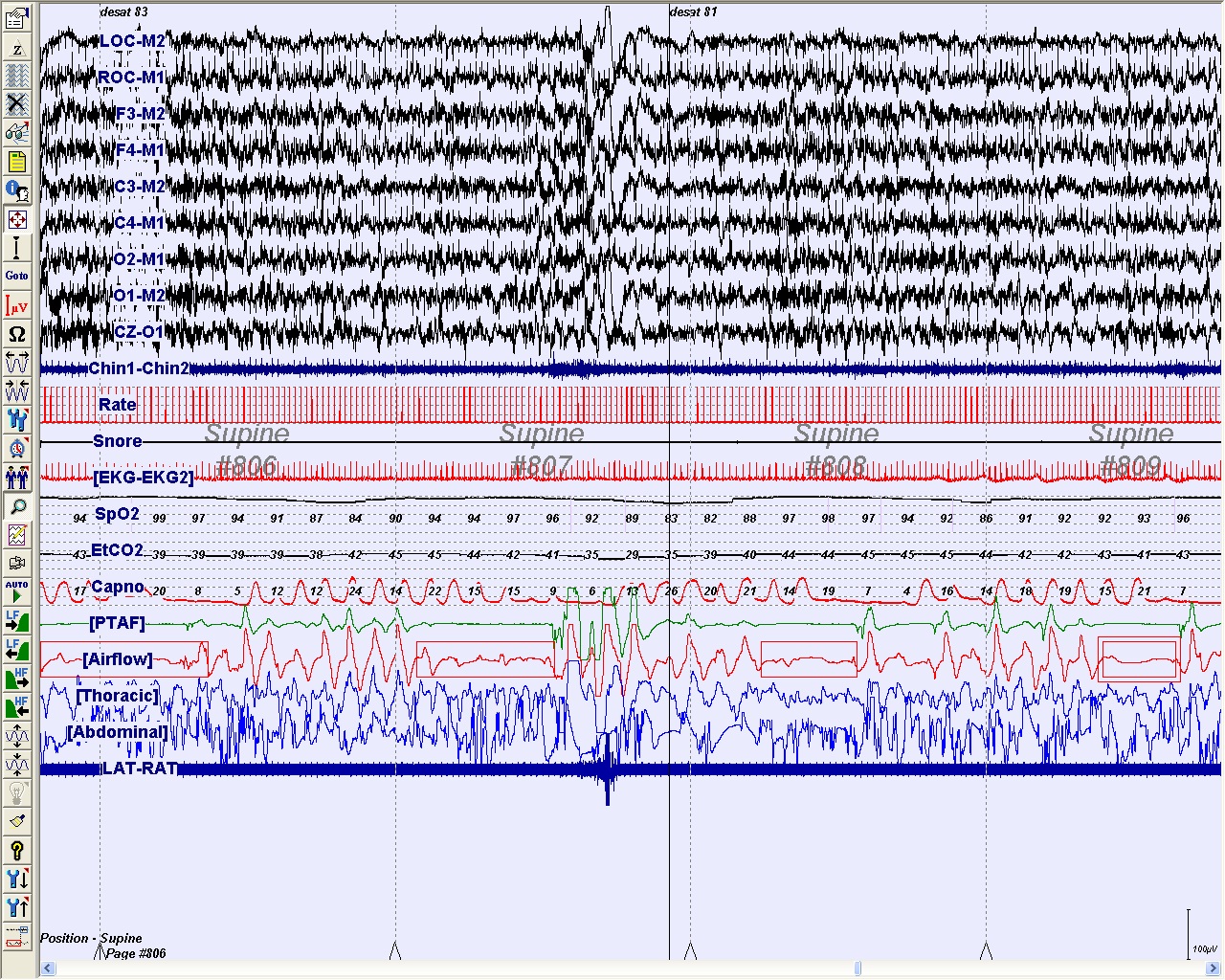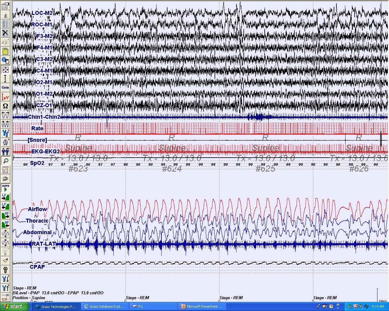 The patient was subsequently referred for a CPAP titration sleep study. Panel C demonstrates a 2-minute epoch of a nocturnal PSG for CPAP titration that identified an optimal treatment pressure of 13 cm H2O. This epoch demonstrates that CPAP treatment at 13 cm H2O was therapeutic while the patient is in rapid eye movement sleep and supine.