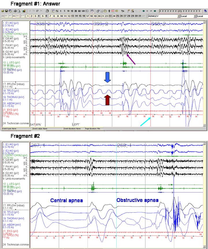 Finally, note should be taken that both fragments show the new recommended EEG and EOG derivations. Both eye leads are referenced to M2 (right mastoid). There are now 3 EEG derivations, all referenced to M1 (left mastoid): the classic central and occipital leads (C4-M1 and O2-M1) and the newly recommended frontal lead (F4-M1).