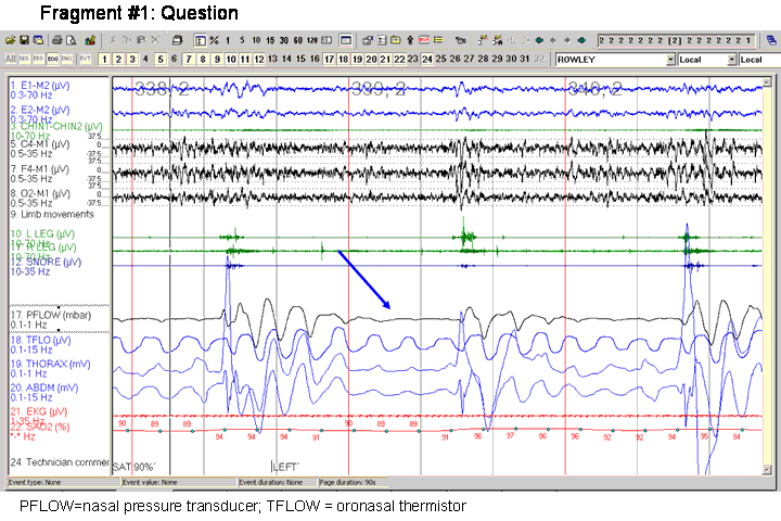 To illustrate an apnea, Fragment #2 is also presented. This is a 60-second fragment and shows a central apnea (left epoch) and an obstructive apnea (right epoch). Note that for both apneas, both the TFLOW and PFLOW signals are flat.