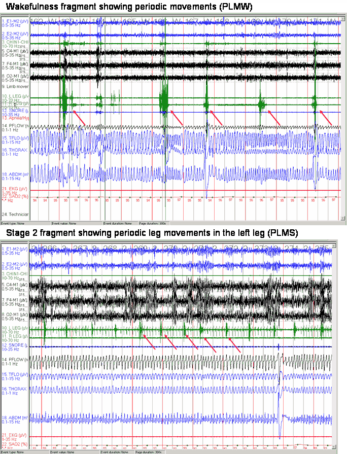 The second fragment shown below is a 5 minute fragment from the same patient obtained during Stage 2 sleep; note the periodic leg movements (see arrows). PLMs are seen in approximately 80% of patients with RLS and are supportive features of a diagnosis of RLS if the one or more of the four characteristic features are not present or not classic.
