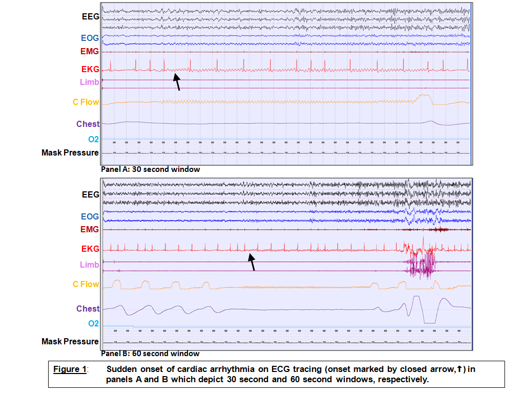 A 61 year old man underwent split-night polysomnography due to complaints of loud snoring and sleep- related apneas as noticed by his wife. Severe obstructive sleep apnea (OSA) was noted during the initial 77 minute diagnostic portion of the study (AHI 73 / hr) and a CPAP level of 10cm H20 was found to treat effectively the patient’s obstructive events during the therapeutic portion. However, frequent central apneas appeared and the patient was switched to an adaptive servo-ventilation (ASV) unit. On initiation of ASV, during two central apnea episodes (post arousal in nature), the sudden onset of an ECG abnormality was noted (figure 1) as demarcated by the arrows in panels A and B which depict a 30 second and 60 second window, respectively, of one such instance. The ECG abnormality dissipated upon the patient’s resumption of breathing in both instances.