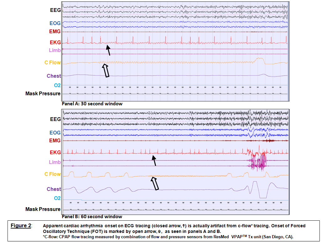 After careful review of all channels at the time of the potential “arrhythmia” resembling atrial flutter, the pattern on the ECG tracing (Figure 2, closed arrow) was noted to be identical to the sinusoidal oscillatory pattern noted on the PAP flow (c-flow) channel (Figure 2, open arrow). The oscillation in the c-flow channel is due to the forced oscillation technique (FOT) which is a low amplitude, high frequency oscillation of pressure used by a variety of PAP devices to aid in differentiating between central and obstructive apneas.1,2 It is also utilized in the clinical setting for the investigation of respiratory mechanics.3 In the specific device used during this case, the FOT algorithm consisted of a 1 cm H20 pulse of pressure delivered at a frequency of 4Hz by the machine upon sensing an apnea and ceases upon sensing resumption of respiration.2 The frequency of oscillation of the patterns in question noted on both c-flow and ECG channels is consistent with this device’s FOT feature (low amplitude oscillation at frequency of 4 Hz), as is the fact that the oscillations ceased once respiration started. Though this pattern was noted throughout the night during other apneic episodes on the c-flow channel with this particular device, we conjecture that the similar artifact observed on the ECG tracing was only noted in these two instances due to the specific body and arm position of the patient which was identical at those times. More specifically, the patient was in the supine position with his right arm extended above and touching his head during the times of the specific ECG artifact. This finding does not represent a cardiac arrhythmia, seizure related artifact or cardiogenic oscillation on airflow signal4 as the ECG artifact is clearly generated by the c-flow channel.