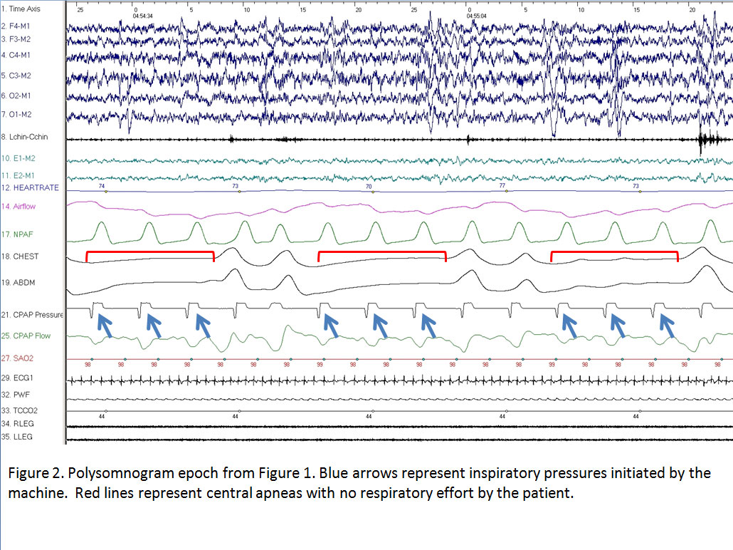 1. The breaths are adequately initiated by the ventilator but because of a short inspiratory time (Ti) the breaths are cycled off before there is time for the delivered pressures to move the chest wall, resulting in central apneas (figure 2).