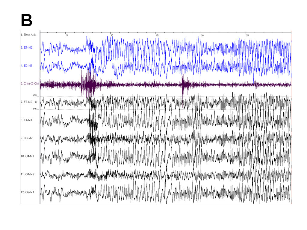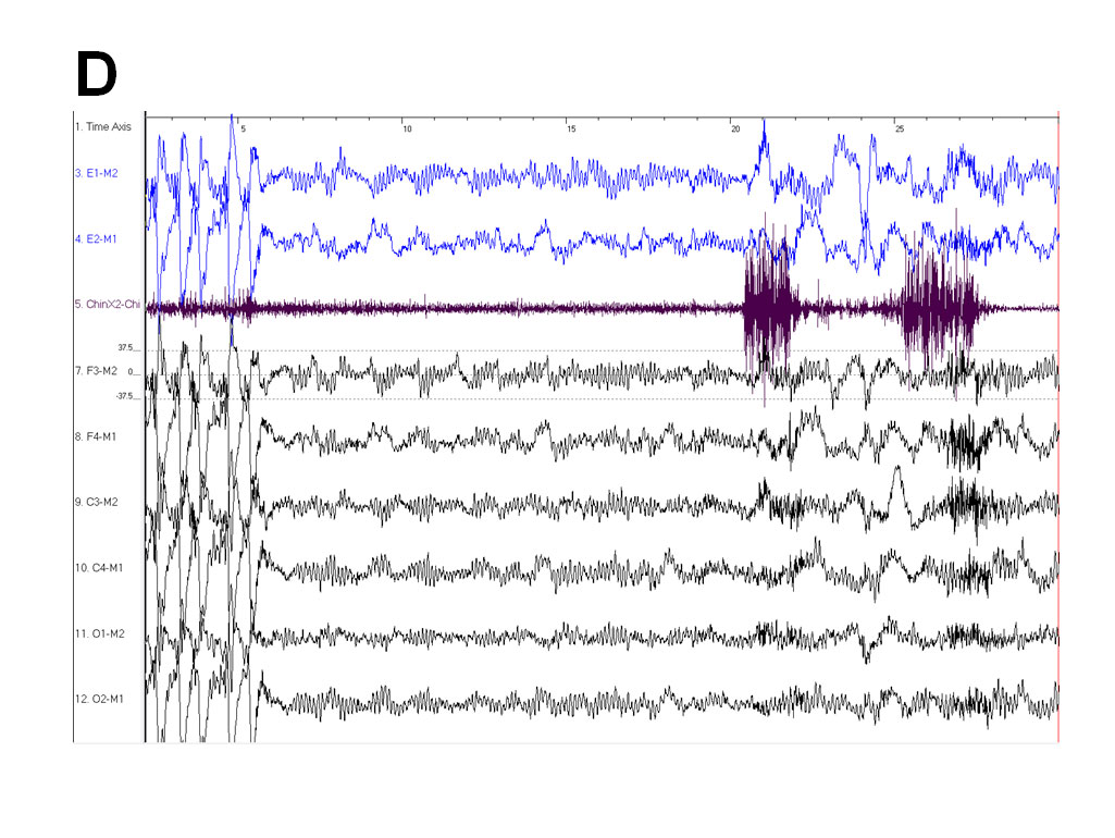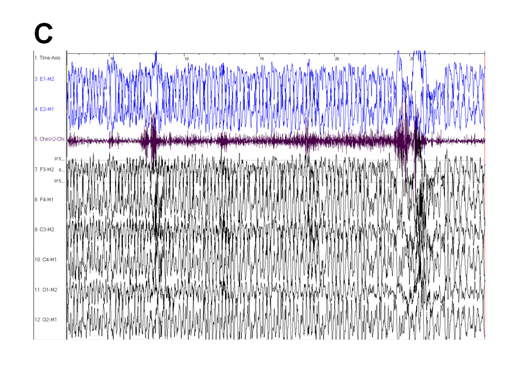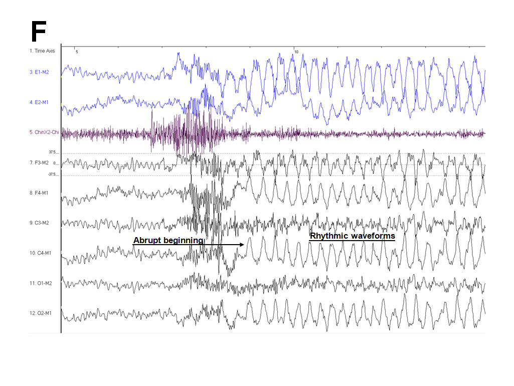 Localized ictal epileptiform activity is also known as electrographic seizure activity. It usually persists for more than several seconds, begins abruptly (see Epoch B and F), and consists of repetitive and rhythmic waveforms that tend to vary in form, frequency and topography through out the seizure (see Epoch B-D and F). Epoch F shows ictal epileptiform activity at standard EEG rates of 30mm/sec. In our patient, tonic-clonic activity was not noted on video monitoring, although there was increase in chin EMG tone (see Epoch C). Ictal EEG patterns that occur in the absence of clinical seizure manifestations are referred to as subclinical ictal or subclinical electrographic seizure activity. Our patient was in NREM sleep during these discharges. Seizures are more common in NREM sleep than in wakefulness or REM sleep but are often subclinical (1). Our patient was subsequently referred for a formal electroencephalogram which confirmed subclinical epileptic activity.
