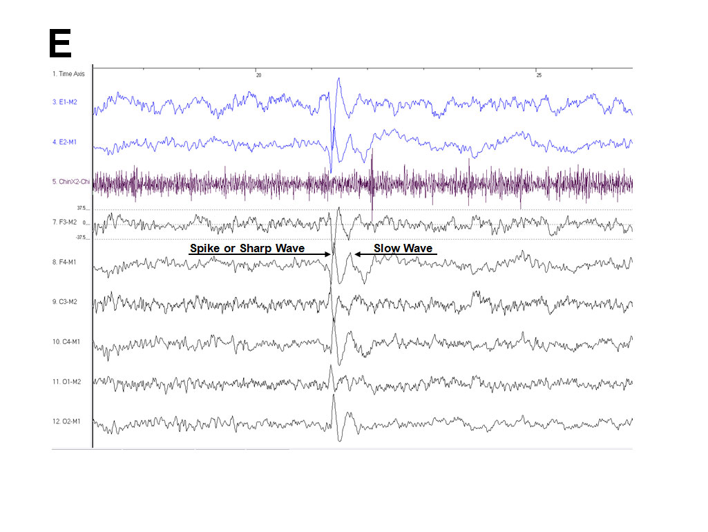 Interictal epileptiform discharges are brief epileptiform activities that occur without behavioral changes or impairment of consciousness. They begin with a fast component (spike or sharp-wave) followed by a slow-wave component (see Epoch A and E). They are usually brief in duration, typically lasting less than one second and almost always exceed the amplitude of surrounding background activity. In our patient we started noticing these discharges as shown in Epoch A. While interictal epileptiform discharges are asymmetric with two distinct components, non-epileptiform transients are typically symmetric thus helping to distinguish the two.