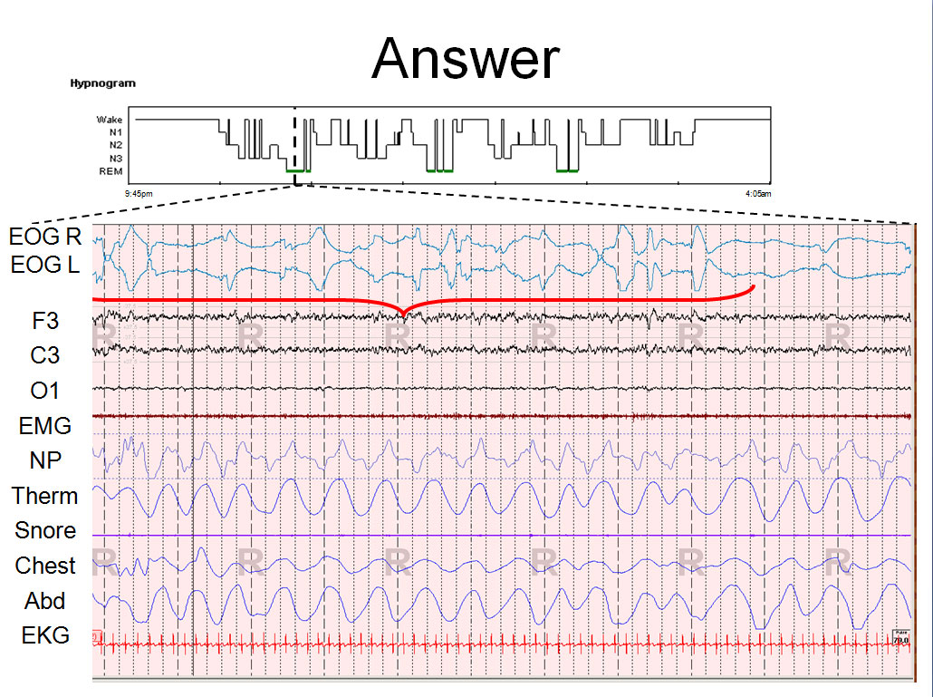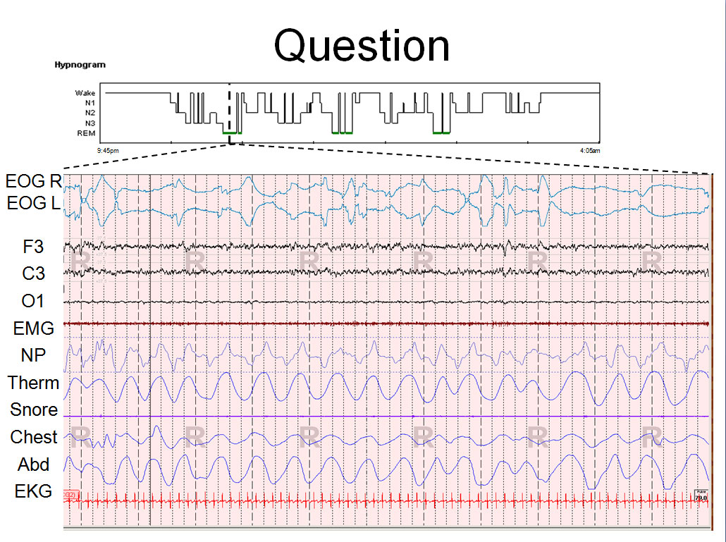 Major depressive episode occurs when depressed mood or loss of interest occurs for at least two weeks, in addition to at least four other secondary symptoms. Sleep disturbances are common in depression, particularly early morning awakenings or frequent or prolonged awakenings at night. Polysomnographic abnormalities in major depression include 1) sleep continuity disturbances; 2) reduced N3 sleep stage; 3) decreased REM latency; 4) increased REM density; and 5) increased REM sleep early in the usual sleep period.[1] While no single PSG abnormality is particularly sensitive or specific, the more abnormalities found, the more likely the diagnosis. A high REM density (>12.56 REM’s/minute) is reported to have a sensitivity of 82% and specificity of 80% in one study.[2] The patient presented has #1, #3, #4 and #5, and was, on subsequent clinical evaluation, diagnosed with major depression.