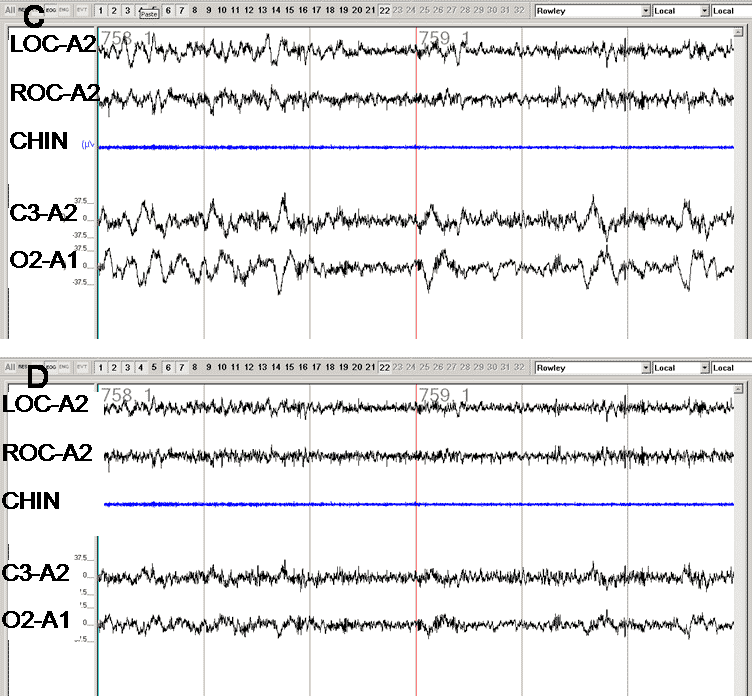 In panel A, the low frequency filter is turned off for both the EOG and EEG. As a result, a low frequency artifact (likely sweat artifact) is observed in both EOG and EEG channels. In Panel B, the low frequency filter is turned ‘on’ and set at the recommended 0.3 Hz; note the attenuation but not elimination of the slow wave artifact. Panels C and D show the same 60 seconds after changing the low frequency filter to 0.5 Hz (Panel C) and 1.0 Hz (Panel D). Note the almost total attenuation of the signal with the filter set at 1.0 Hz.