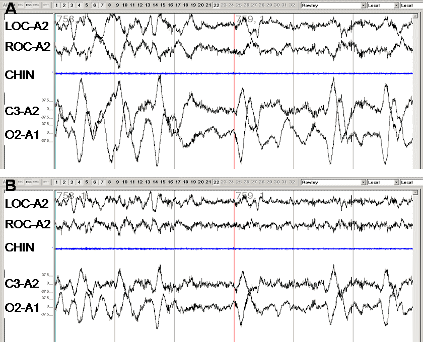 Panels A and B show the same 60 seconds of EOG and EEG from an overnight sleep study. What did the author change between the two panels?