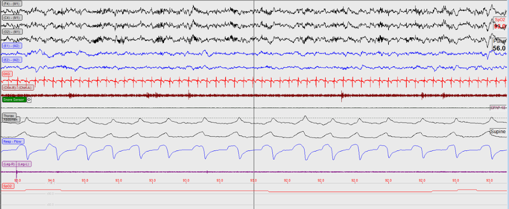 Figure 2: Sixty second epoch from titration portion of the study with 12 cm of continuous positive airway pressure using a nasal mask and chinstrap.