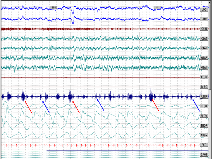 Abbreviations: LOC: left oculogram; ROC: right oculogram; CHIN: chin EMG; C3A2, C4A1: central EEG leads; O1A2, O2A1: occipital EEG leads; LLEG: left leg EMG; RLEG: right leg EMG; ASNR: snoring channel; TFLO: thermistor flow channel; FLOW: nasal pressure flow channel; THOR: thorax effort channel; ABDM: abdominal effort channel; EKG: electrocardiogram; SAO2: oxygen saturation channel.