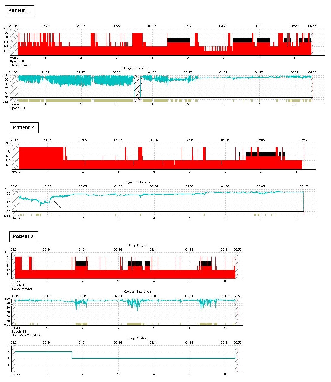 Three hypnograms each display the sleep stage and oxygen saturation of a polysomnogram from 3 separate patients.