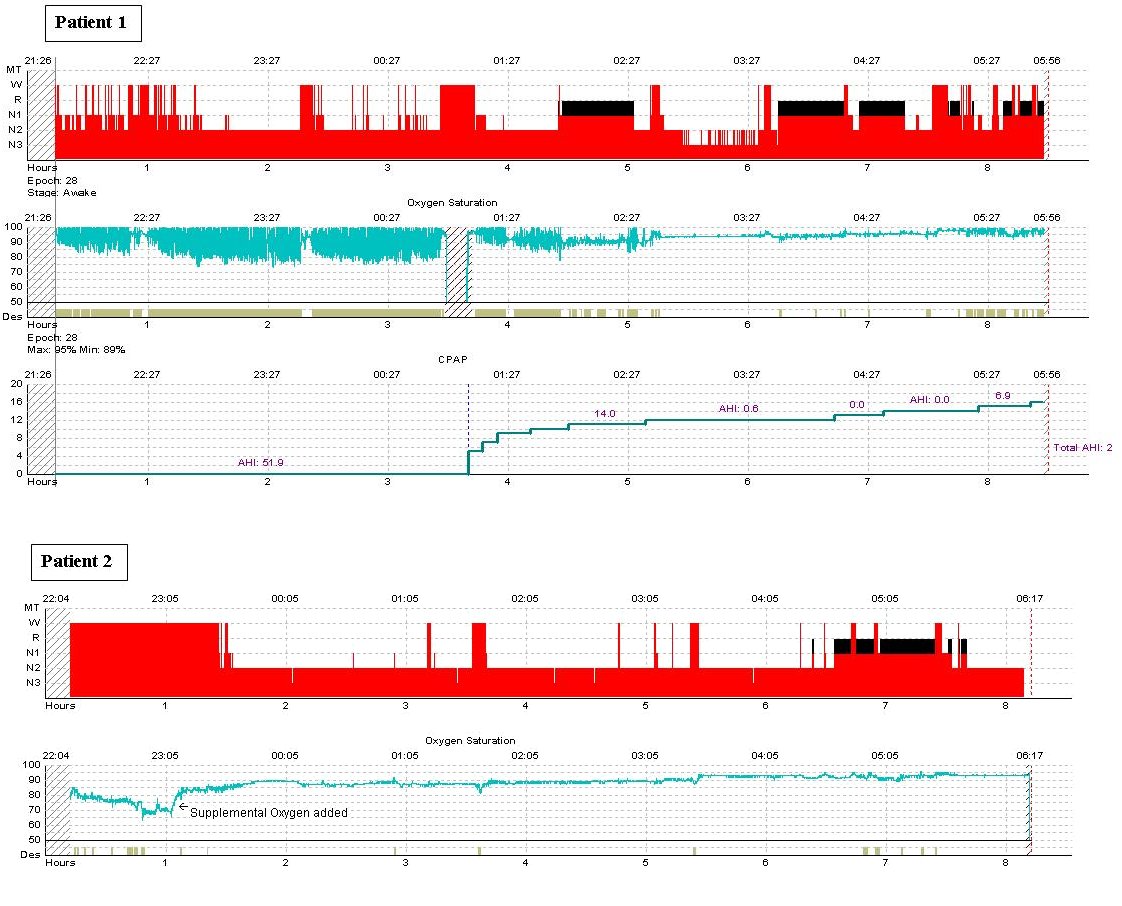 Discussion: The oxygen saturation during the pre-treatment portion of the hypnogram is clearly abnormal with a classic “sawtooth” pattern. The administration of CPAP progressively improved the oxygen saturation as the pressure provided approached a therapeutic pressure. In addition, as the therapeutic CPAP level was achieved, the sleep fragmentation associated with OSA was effectively treated and a rebound in REM and slow wave sleep was observed. Beyond the optimal CPAP of 14 cm of water pressure, which effectively treated the obstructive respiratory events, the patient developed central apneas causing periodic oxyhemoglobin desaturations.