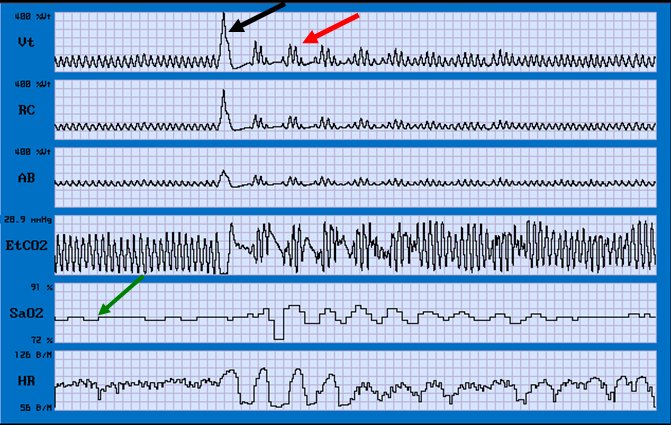 The fragment shows a time series of nocturnal inductive plethysmographic recordings obtained at a high altitude research station (Jungfrau-Joch, Switzerland, 3,450 m above sea level). Note the low SaO2 (approximately 80%) at the beginning of the tracing (green arrow). A short sequence of periodic breathing (red arrow), associated with pronounced fluctuations in SaO2 and HR, begins with a sigh as the initial disturbance (black arrow). The breathing pattern normalizes after only a few cycles of periodic breathing.