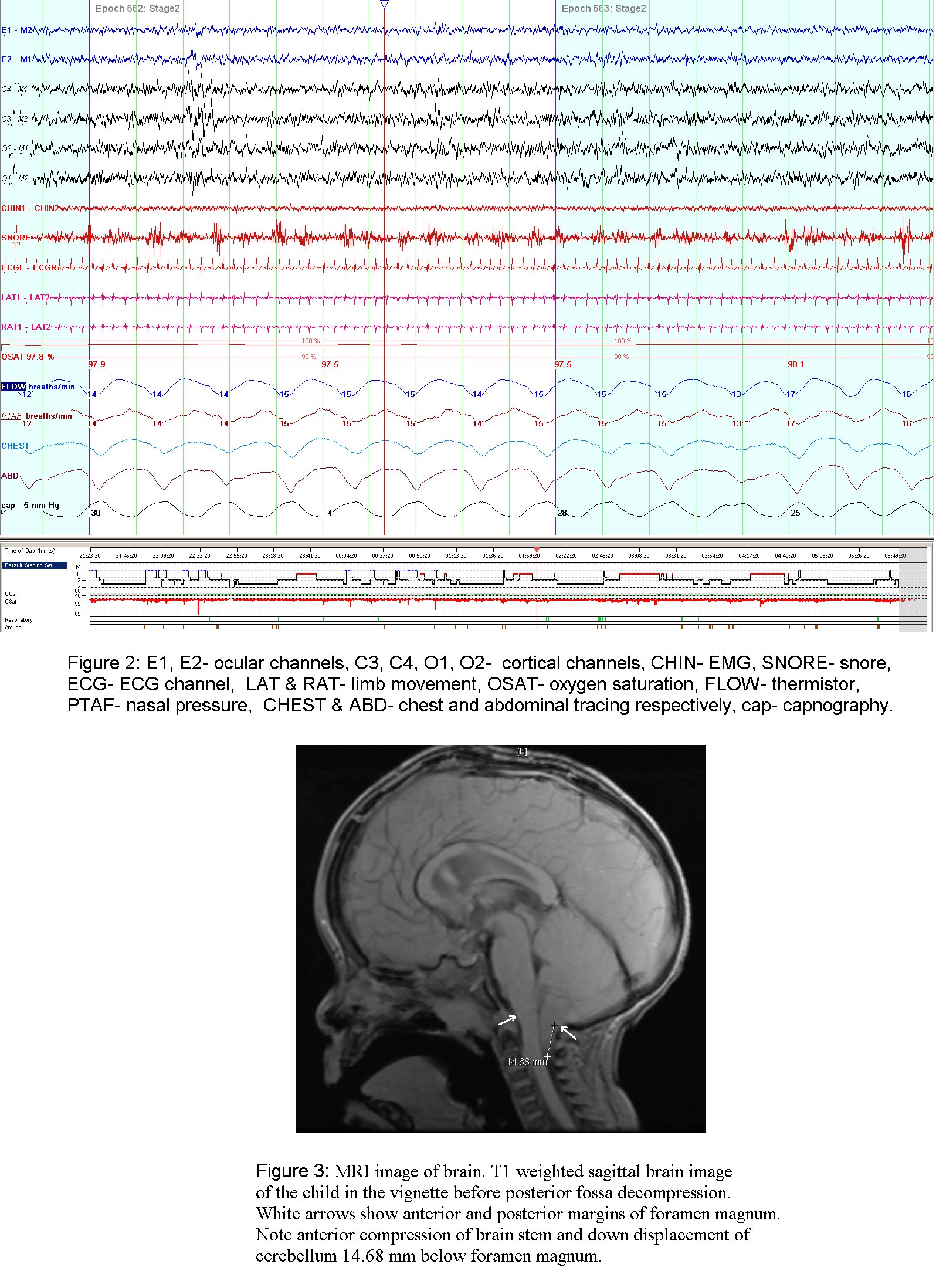 The full polysomnography of the child described in the vignette showed mild snoring but no significant obstructive events. In fact, the prominent findings were frequent central apneas (central apnea index 60/hour), frequent oxygen desaturations, SpO2 nadir of 84%, and bradypnea of 4-8 breaths/min. This respiratory pattern suggests a central nervous system lesion, particularly in the region of the brain stem. A brain MRI demonstrated a Chiari type I malformation with a normal ventricular size. No additional neurological findings were noted and the ventriculoperitoneal shunt was considered well functioning.