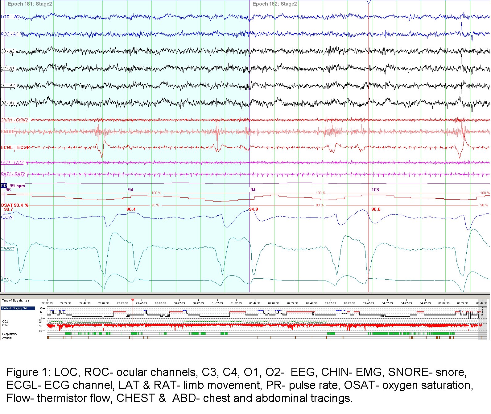 A 3-year old infant boy with a history of craniosynostosis and hydrocephalus for which he had previously undergone surgical repair and placement of a ventriculoperitoneal shunt was referred for a sleep study because of snoring, large adenoid and tonsils, and observed apnea during sleep. A representative 60-second epoch of the sleep study is presented below.