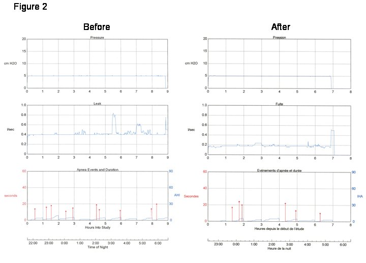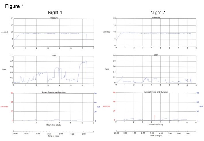 Figure 2 shows adherence data from 2 representative nights prior to and following the patient’s "intervention" with her equipment.