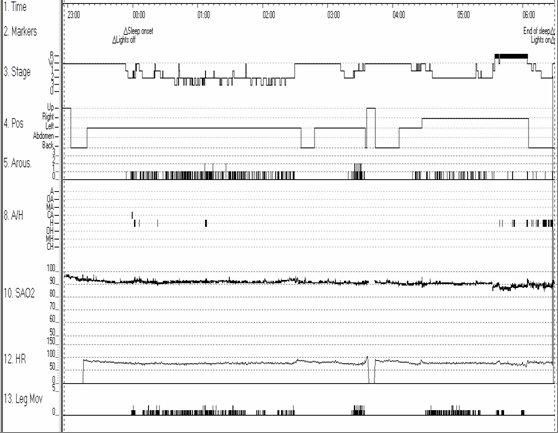 A 52-year old African American male with history of hypertension, Crohn’s disease, stroke, depression and multiple back surgeries presents for an assessment of sleep apnea to the sleep laboratory for an overnight sleep study. The hypnogram is shown below.
