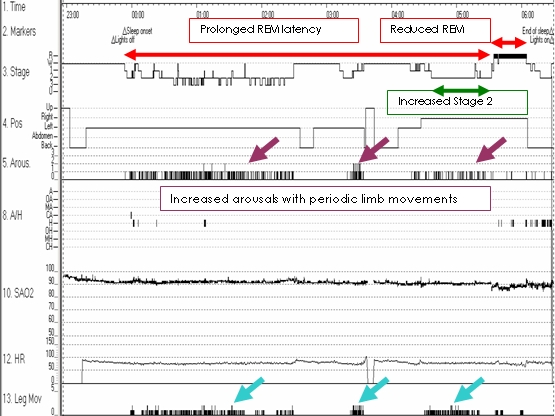 1) There is prolonged REM latency with reduced REM sleep, increased stage 2 and increased arousals with periodic limb movements.