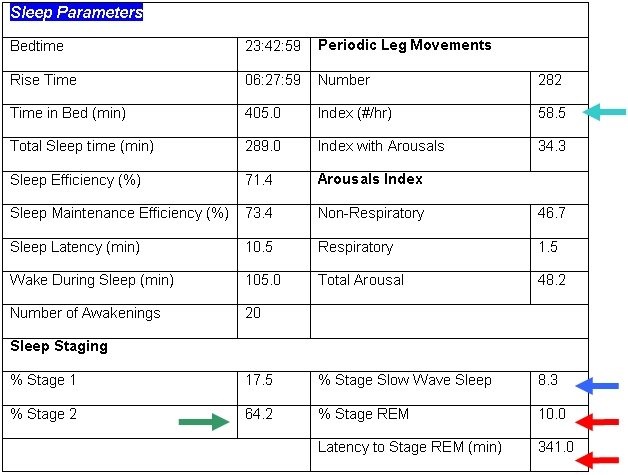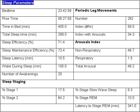 Patients who are taking anti-depressants such as tricyclic antidepressants or selective serotonin reuptake inhibitors may have reduced REM sleep and a prolonged REM latency[1]. This patient was noted to have increased stage 2 sleep and decreased slow wave sleep which may be observed in the setting of benzodiazepine medication use [2,3]. This patient was also noted to have a significant number of arousals secondary to periodic limb movements which may be noted in patients with restless legs syndrome[4]. A potential secondary etiology of restless legs syndrome includes use of tricyclic antidepressants or selective serotonin reuptake inhibitors.