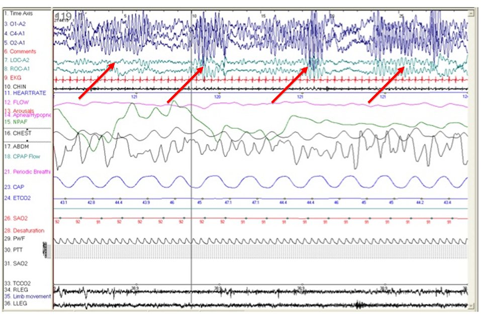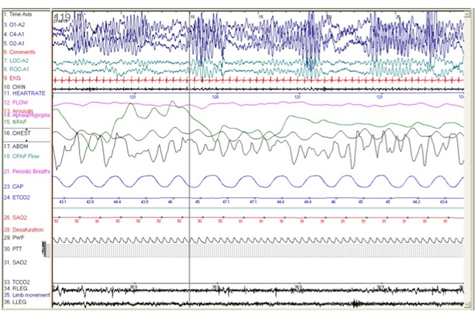 In the 30 second epoch presented here, recorded close to sleep onset, a mildly irregular breathing pattern is observed. However, there is no clear evidence of sleep-disordered breathing in this epoch.
