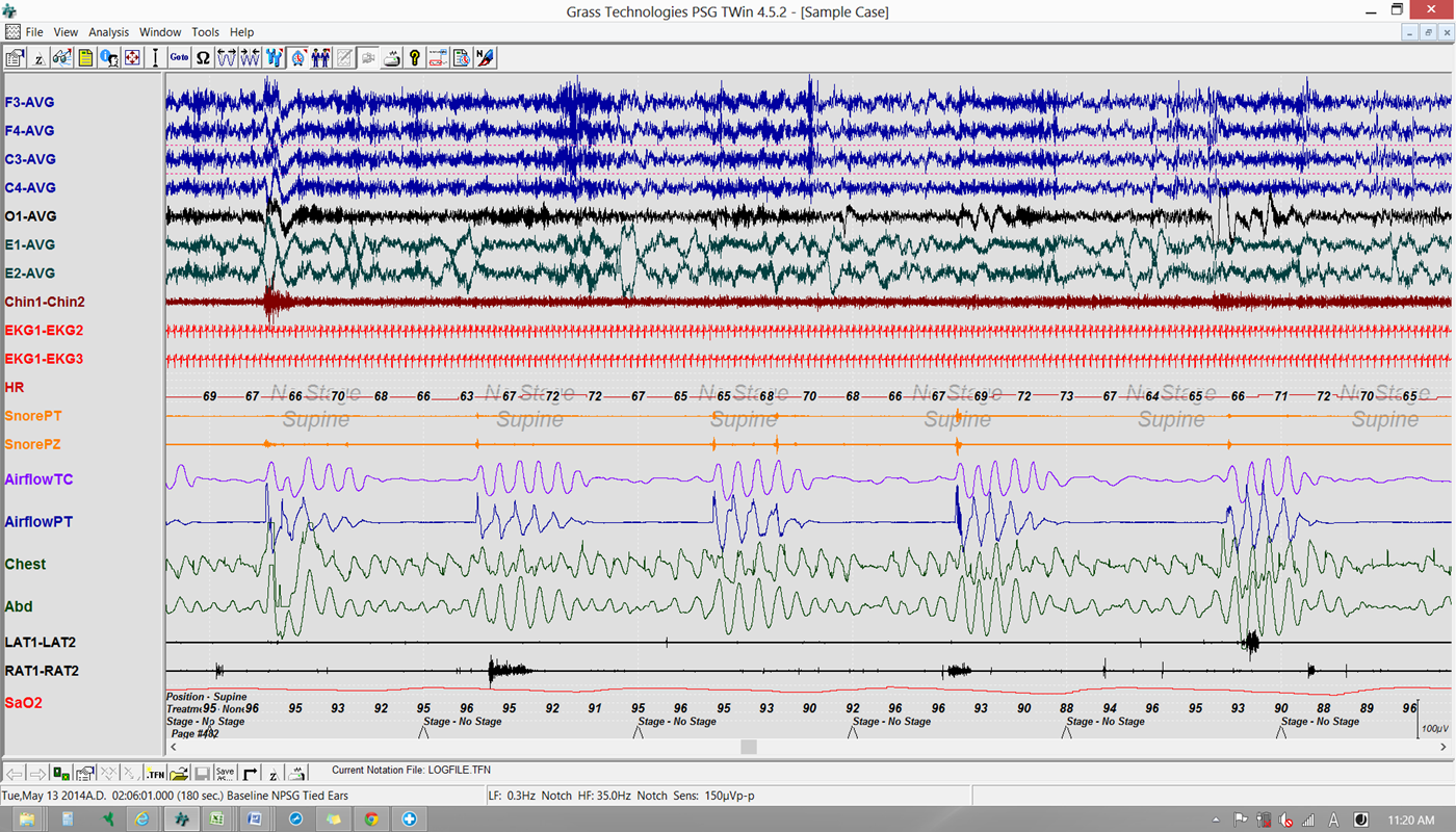 OXYHEMOGLOBIN SATURATION: (pulse oximetry with beat by beat sampling) Mean oxyhemoglobin saturation was 94.7%. Oxyhemoglobin saturation was below 88% for 2 minutes. The SaO2 ranged from 86% to 99%. The patient was studied on room air.